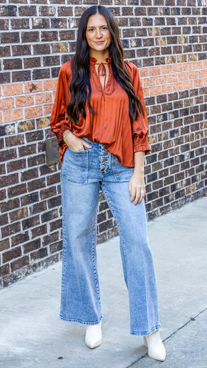 High rise clean hem wide leg jeans in button fly with an exceptional blend of comfort and fit. Crafted with a perfect balance of cotton, polyester, and spandex for a lasting, versatile wear. These jeans are ideal for any lifestyle, offering a sleek and polished look with functional pouch pockets for every occasion.